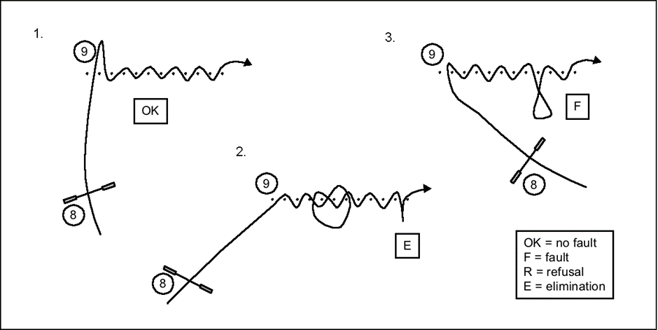 1) и 2) собака приземляется до линии отказа следующего препятствия (тоннель), пересекает ее один раз и перепрыгивает через препятствие, который она должна преодолеть – «отказ», но не снятие;