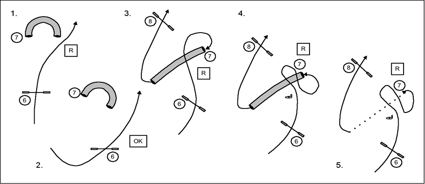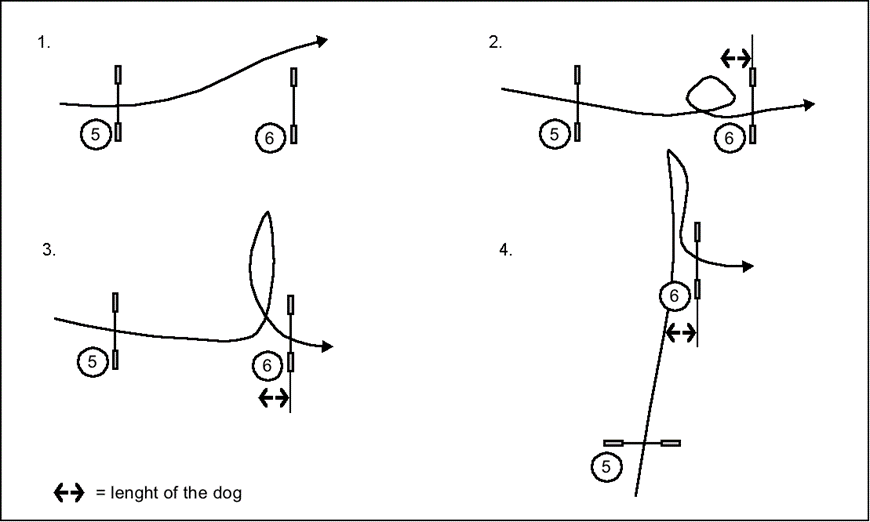 5) собака приземляется за линией отказа следующего препятствия (слалом), проходит через него туда и обратно (второй раз возвращается в сторону проводника), а потом заходит в него – «отказ», но не два отказа, так как собака приняла только одну попытку преодолеть препятствие и не снятие за неверную последовательность.