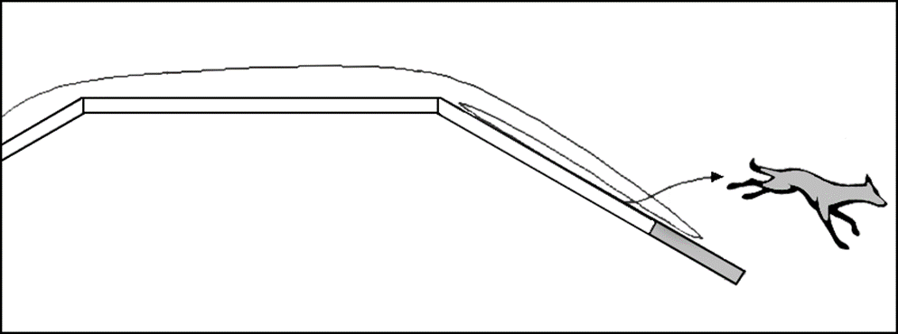 2) собака приземляется до линии отказа следующего препятствия (тоннель) и пересекает эту линию, двигаясь по направлению к горке – «отказ» (собака видела тоннель во время того, когда двигалась к горке);