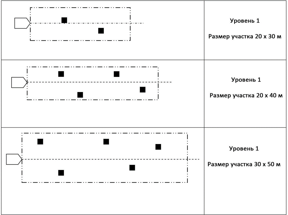 Рельеф: любая естественная поверхность (трава, пашня, лесные участки). Допускается наличие деревьев. Необходимо избегать поверхности, на которой возможен визуальный обыск местности собакой: короткая трава (газон) и тому подобные участки.