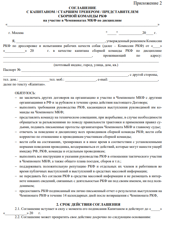 7.1. Все отношения между РКФ и проводниками, старшими тренерами, капитанами, представителями в составе сборных команд РКФ на Чемпионате МКФ регламентируются двусторонним соглашением, заключаемым не позднее, чем за 1 месяц до соответствующего Чемпионата МКФ.