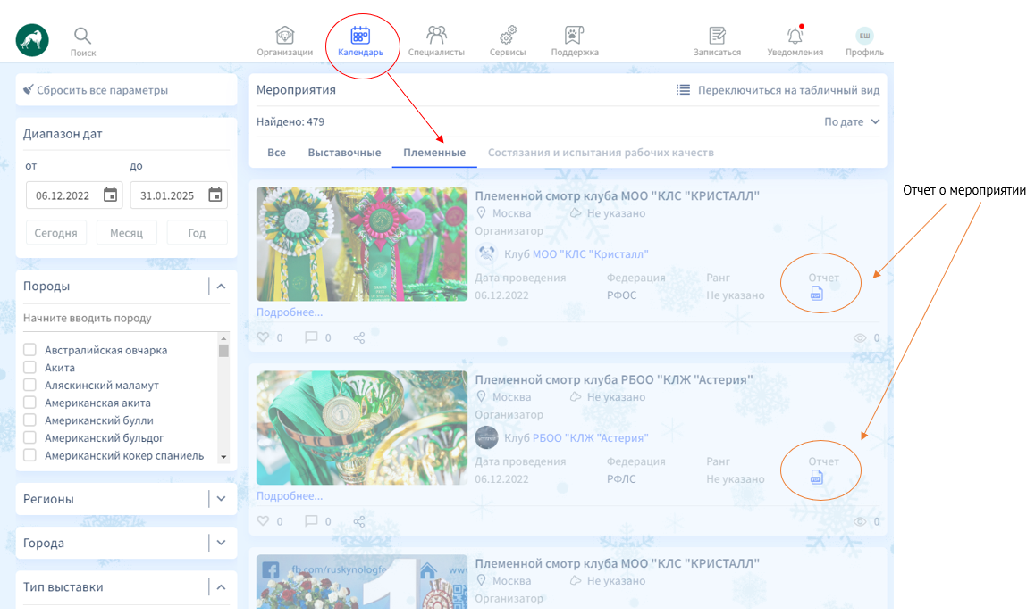 Календари кёрунга и племенных смотров находятся на платформе RKF.Online в разделе Календарь - Племенные (мероприятия).