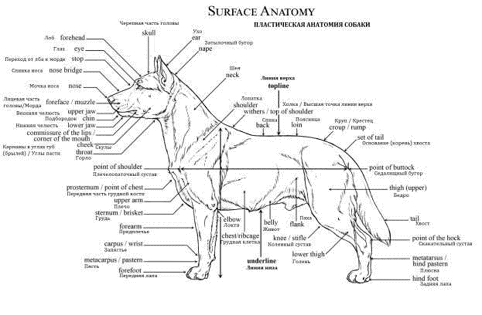 - Длина морды от кончика мочки носа до перехода (от лба к морде) равна длине черепной части, измеренной от перехода до затылочного бугра.
